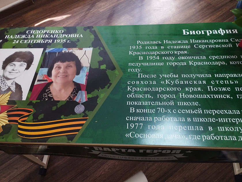 Вот такую парту героя посвятили учительнице начальных классов Сидоренко Надежде Никандровне, проработавшей в санатории «Сосновая дача» 58 лет. Открытие парты героя приурочили к её 90-летию.
