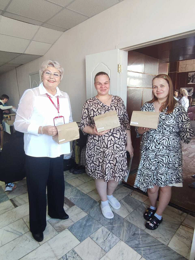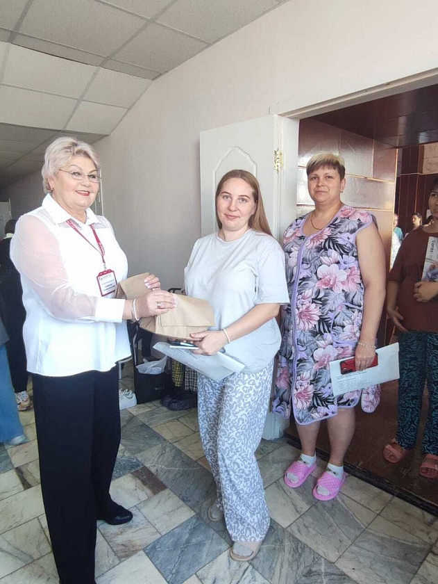 Начальник отдела сопровождения застрахованных лиц Тремаскина Наталья Владимировна и страховой представитель Стенникова Татьяна Захаровна раздали всем беременным памятные подарки, а также тематические памятки и буклеты.