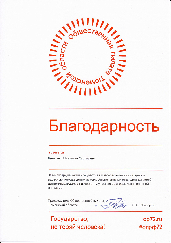 Высокая оценка была присвоена Наталье Булатовой за активное участие в благотворительных инициативах и организацию адресной помощи детям из малообеспеченных и многодетных семей, а также детям участников специальной военной операции.