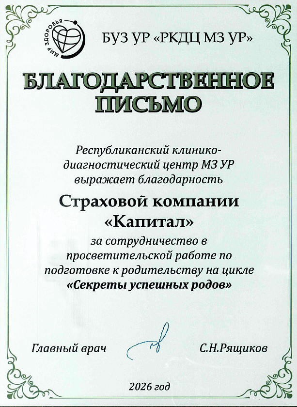 Филиал «Капитал МС» в Удмуртии получил благодарственное письмо от Республиканского клинико-диагностического центра за активное участие в просветительском проекте для будущих родителей «Секреты успешных родов».