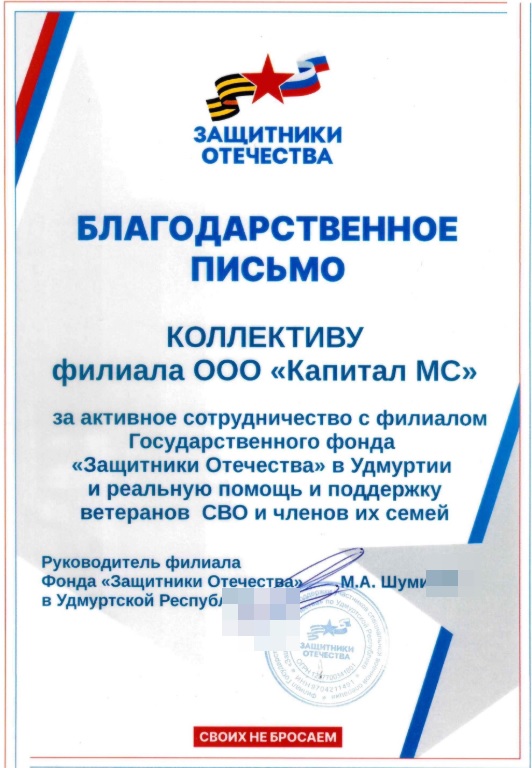 «Капитал МС» в Удмуртии отмечен благодарностью филиала фонда «Защитники Отечества»