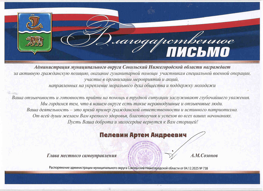 11 декабря 2025 года в Районном доме культуры муниципального округа Сокольский Нижегородской области прошла торжественная церемония награждения волонтеров и активистов, посвященная Дню волонтёра (5 декабря). Глава местного самоуправления муниципального округа Сокольский Нижегородской области вручил благодарственные письма отличившимся добровольцам за активное участие в организации помощи участникам специальной военной операции и их семьям.