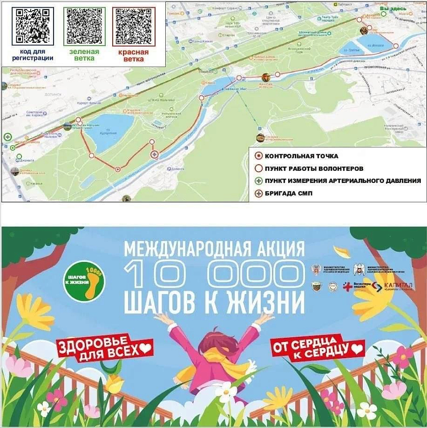 В столице Кабардино-Балкарской республике г. Нальчике прошла Всероссийская акция «10 000 тысяч шагов к жизни», приуроченная ко Всемирному дню здоровья, который отмечается ежегодно 7 апреля. Акция проходит с 2015 г. во всех регионах Российской Федерации по инициативе Всероссийской общественной организации «Лига здоровья нации». Акция проводится с целью популяризации здорового образа жизни и привлечения внимания к важности регулярных физических нагрузок для поддержания здоровья. Ходьба является одним из самых доступных и эффективных способов, профилактики хронических неинфекционных заболеваний, уменьшения риска сердечно-сосудистых заболеваний, снижения веса и укрепления иммунитета.