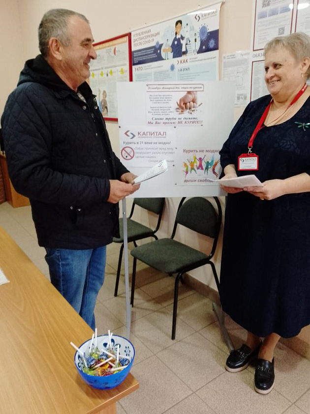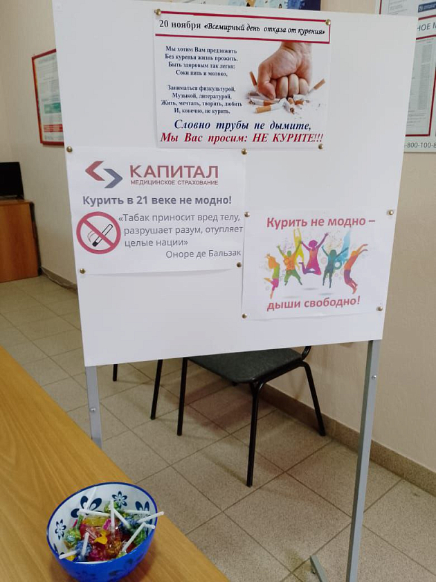 20 ноября, в международный день отказа от курения, страховые представители офисов в р.п. Октябрьский, в г. Урюпинск и в с. Старая Полтавка в пунктах выдачи полисов рассказывали застрахованным гражданам о вреде курения, раздавая тематические информационные материалы и предлагая обменять, тем кто курит, сигареты на сладости, что символизировало отказ от вредной привычки и выбор в пользу здоровья, хотя бы на один день.