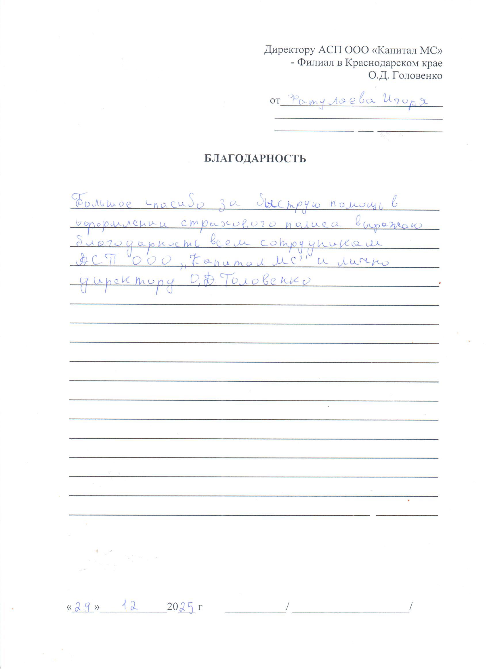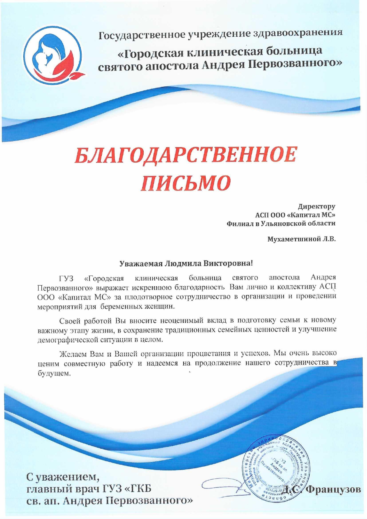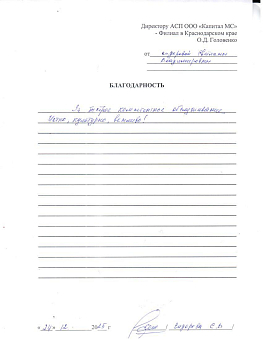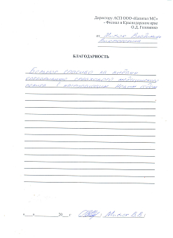 Благодарственное письмо директору АСП ООО...