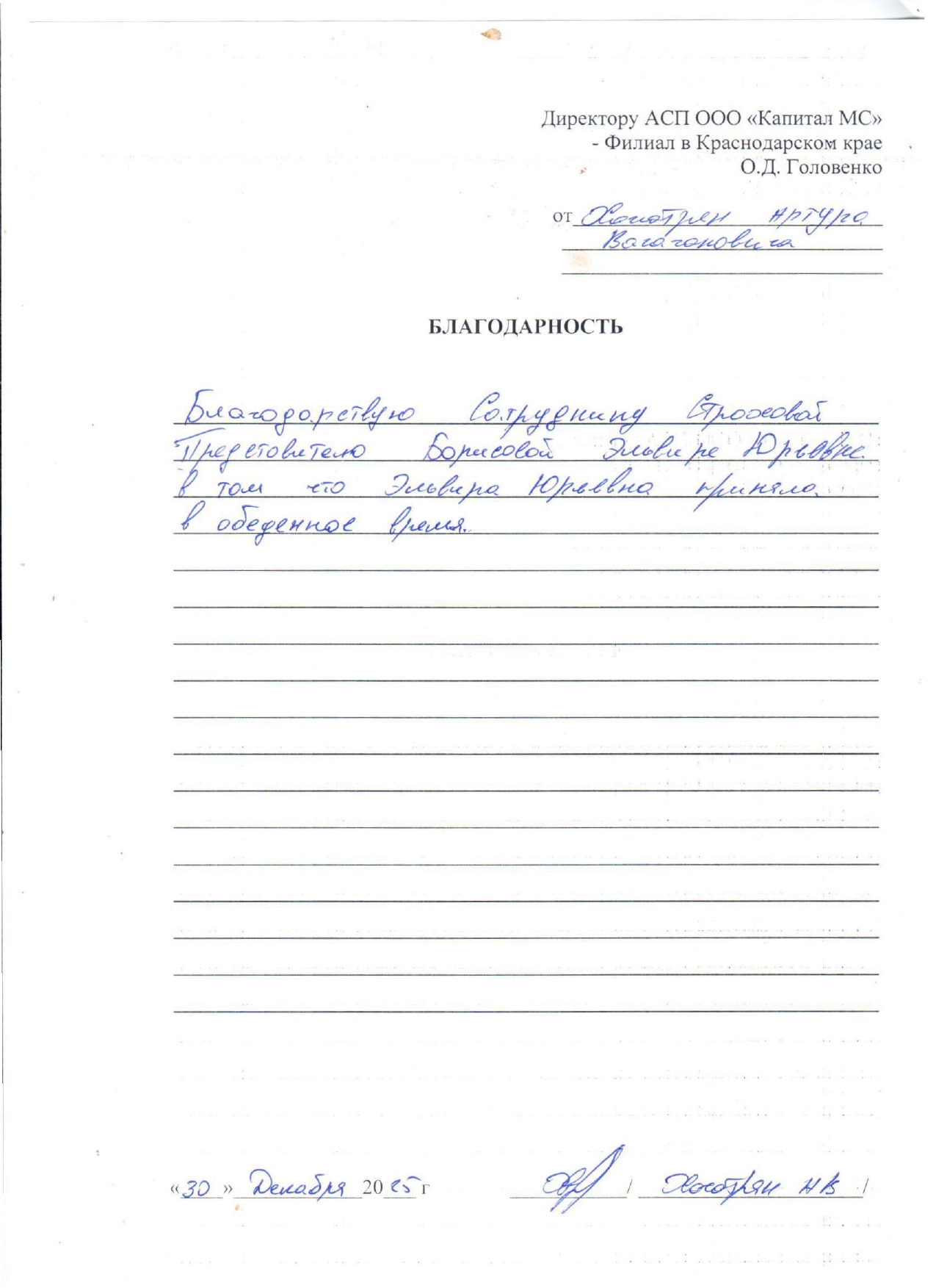 Благодарность Хачатрян А.В.