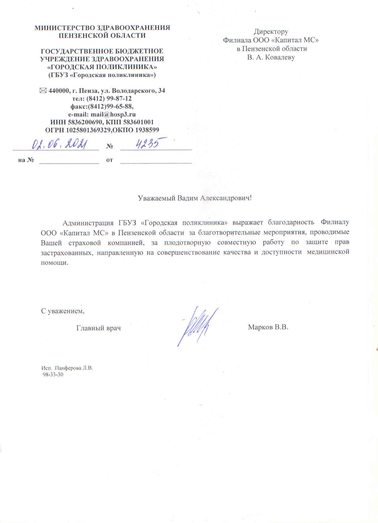 Благодарственное письмо Зав. Мурановским сельским...