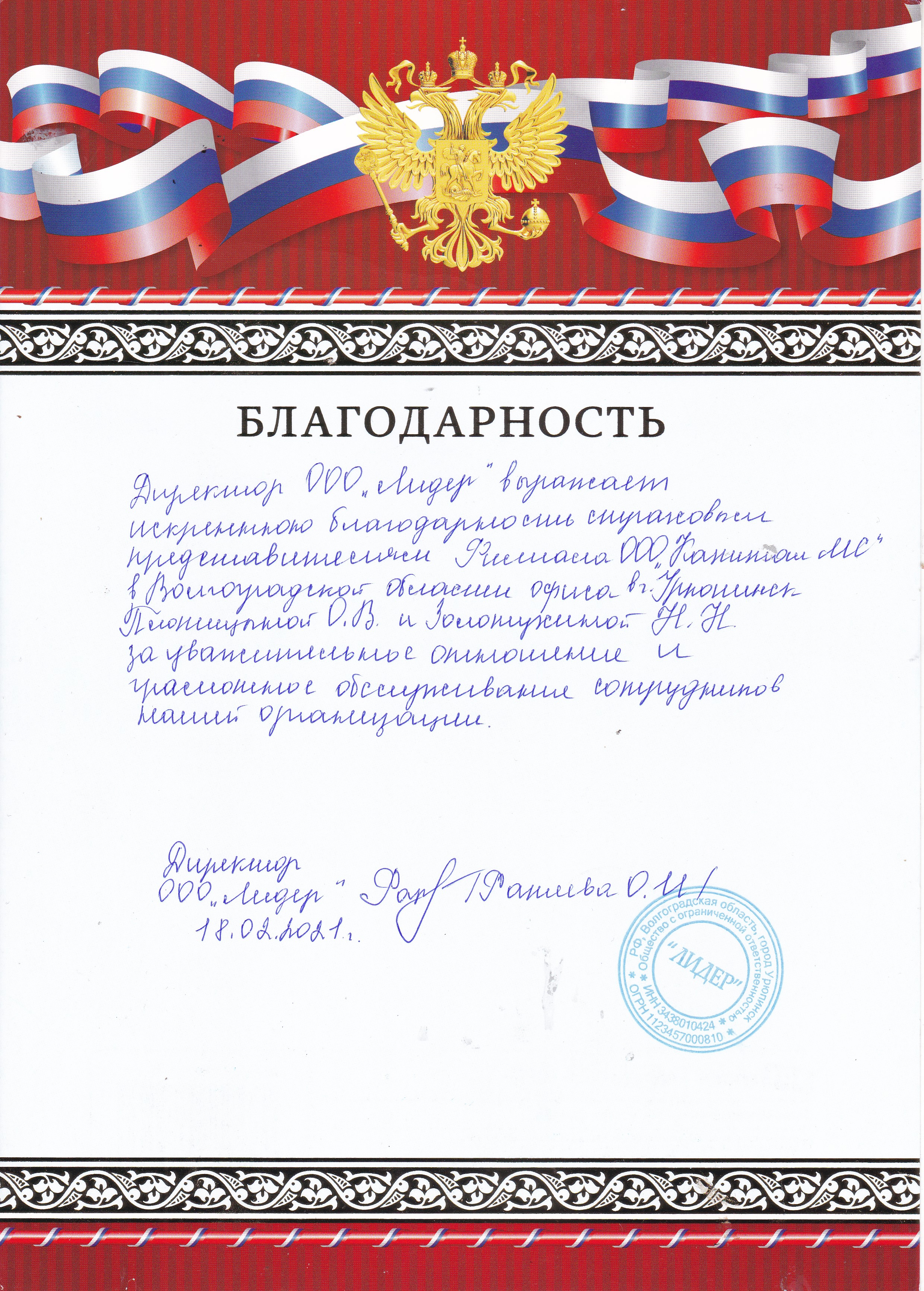 Благодарность ООО "Лидер"