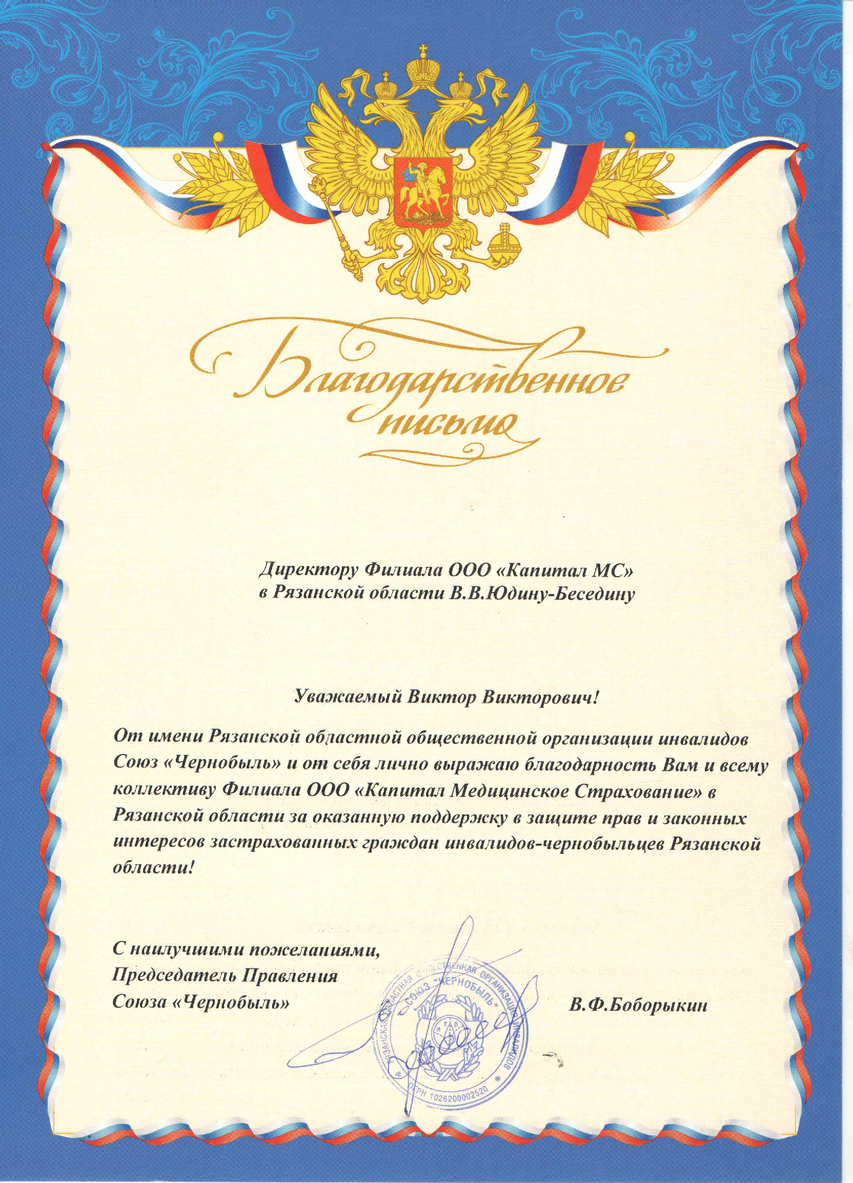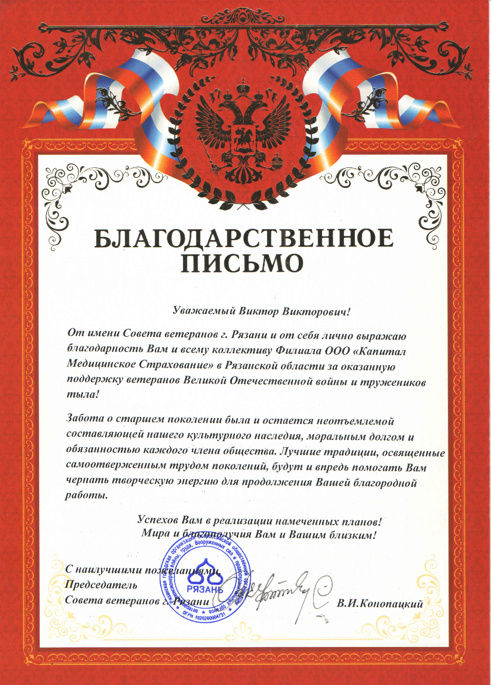 Благодарственное письмо Совета ветеранов г.Рязани...