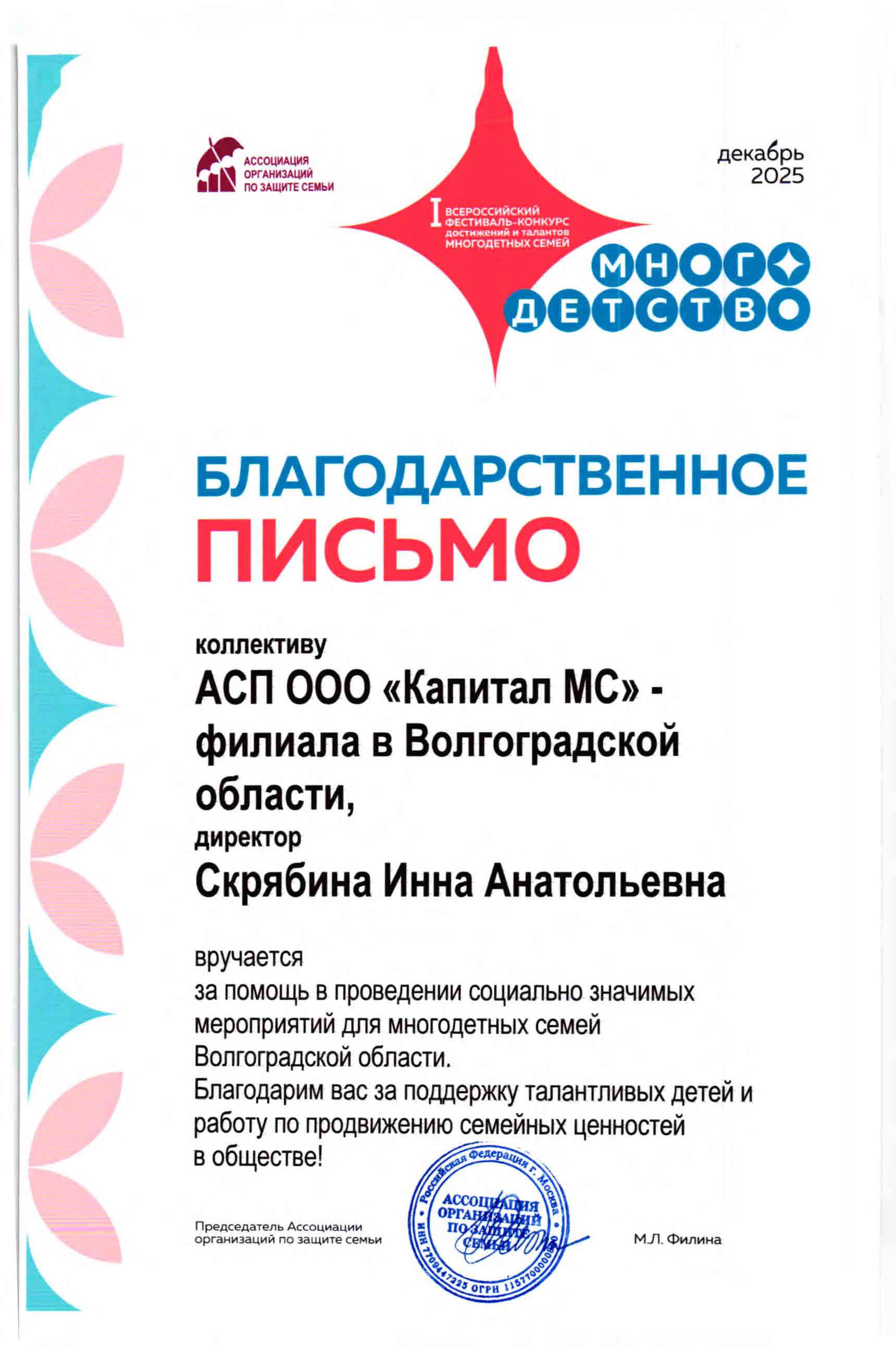 Благодарственное письмо от "Ассоциация...
