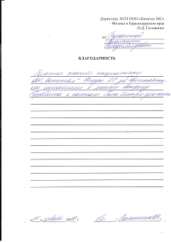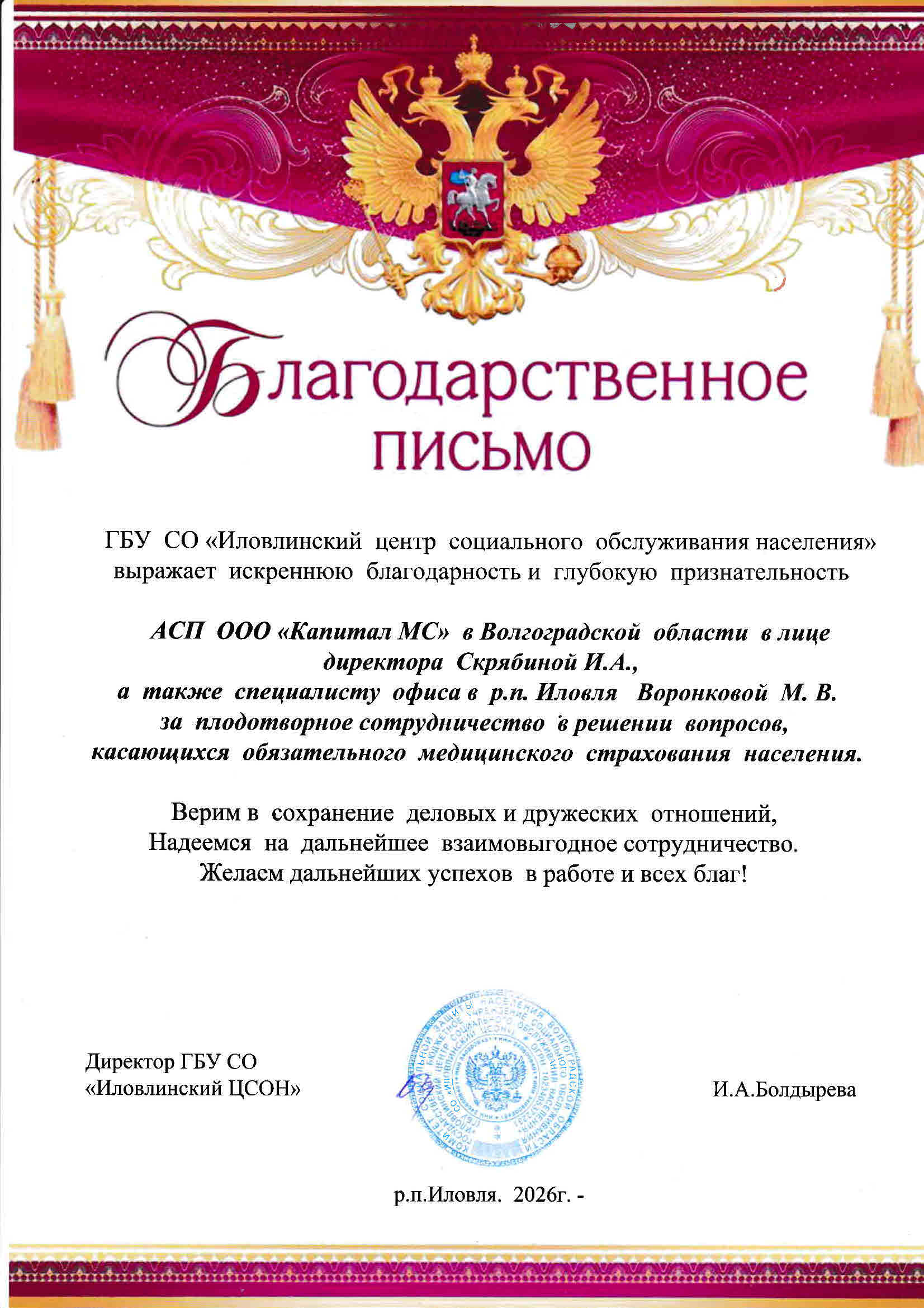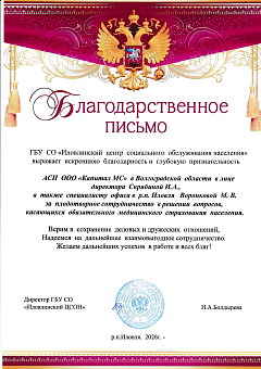 Благодарственное письмо ГБУ СО "Иловлинский центр...