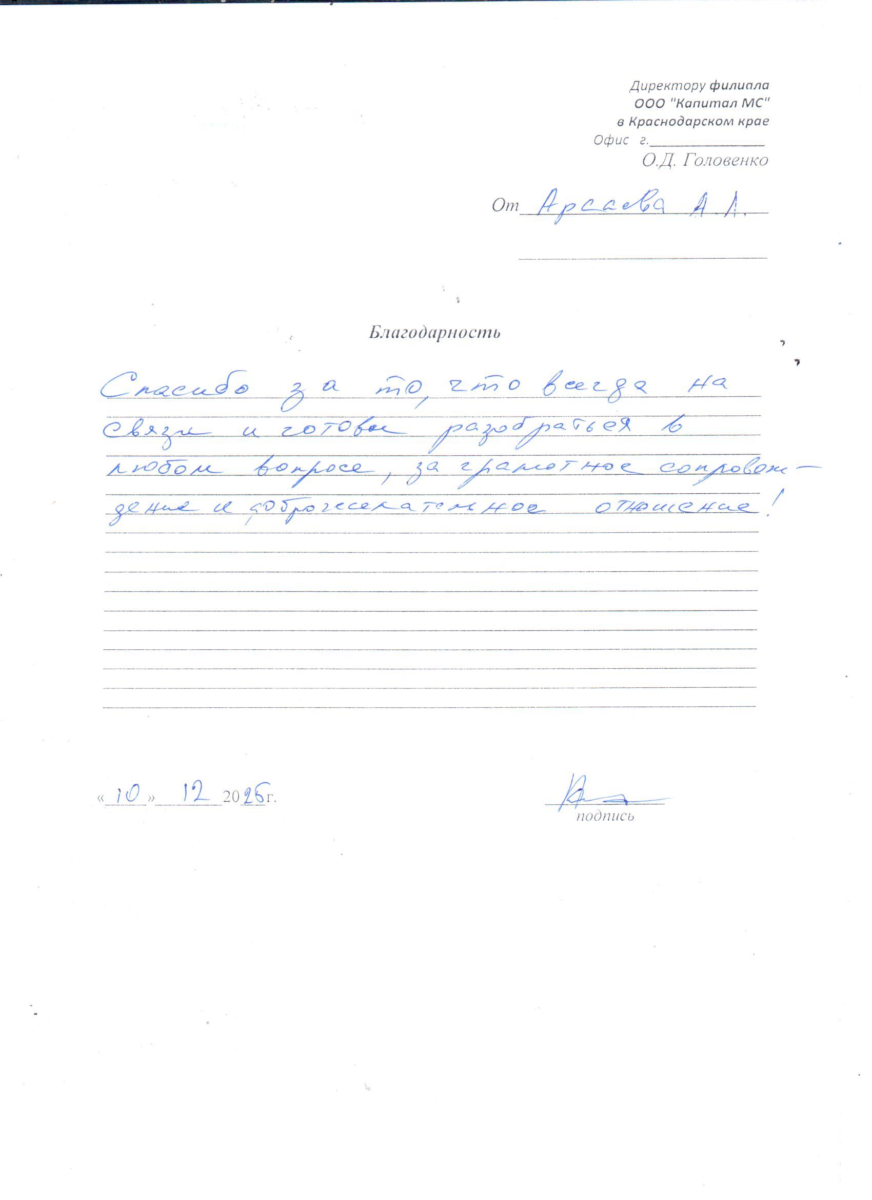 Благодарность АРСАЕВ А.Л.
