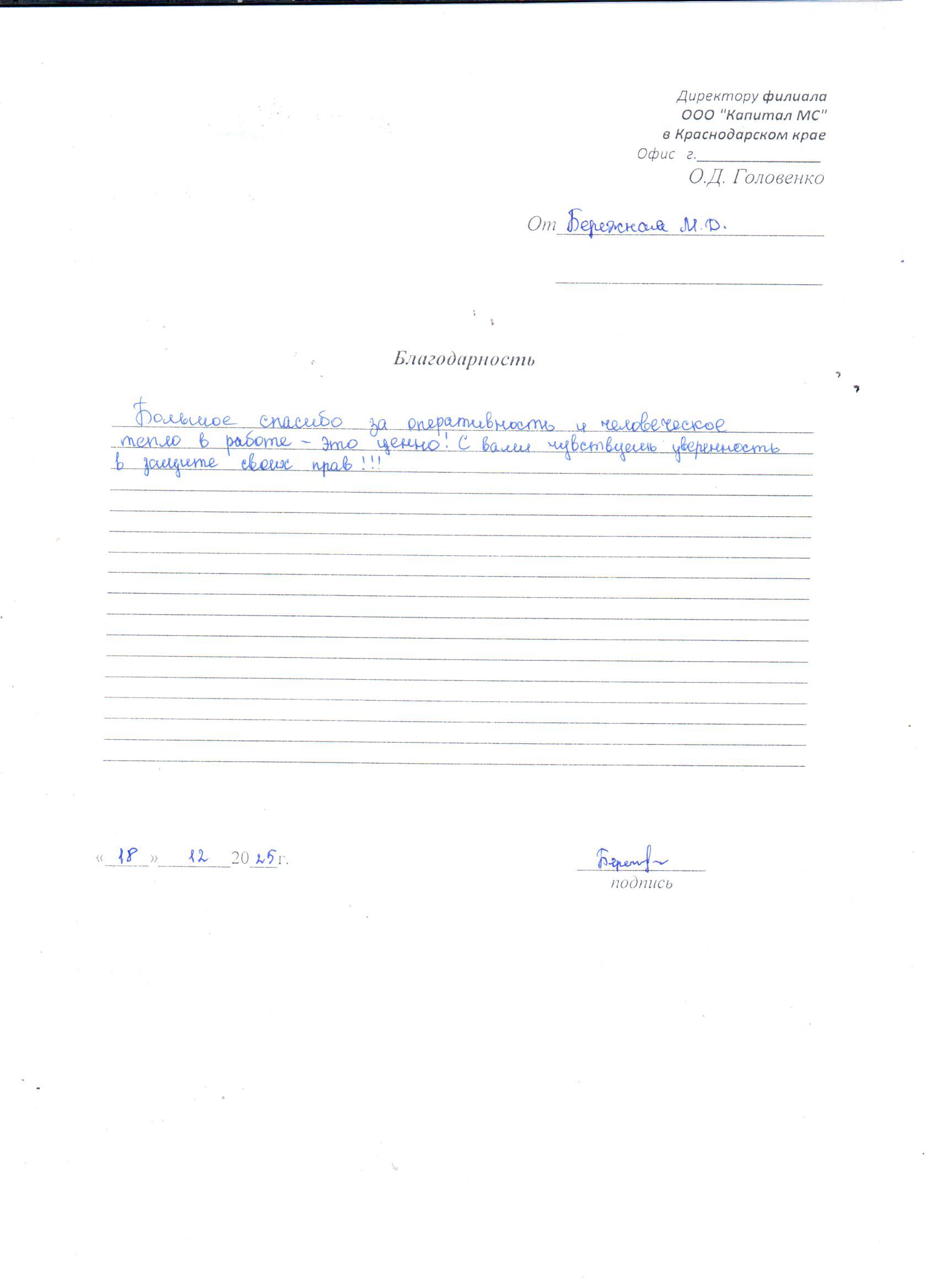 Благодарность БЕРЕЖНАЯ М.Д.