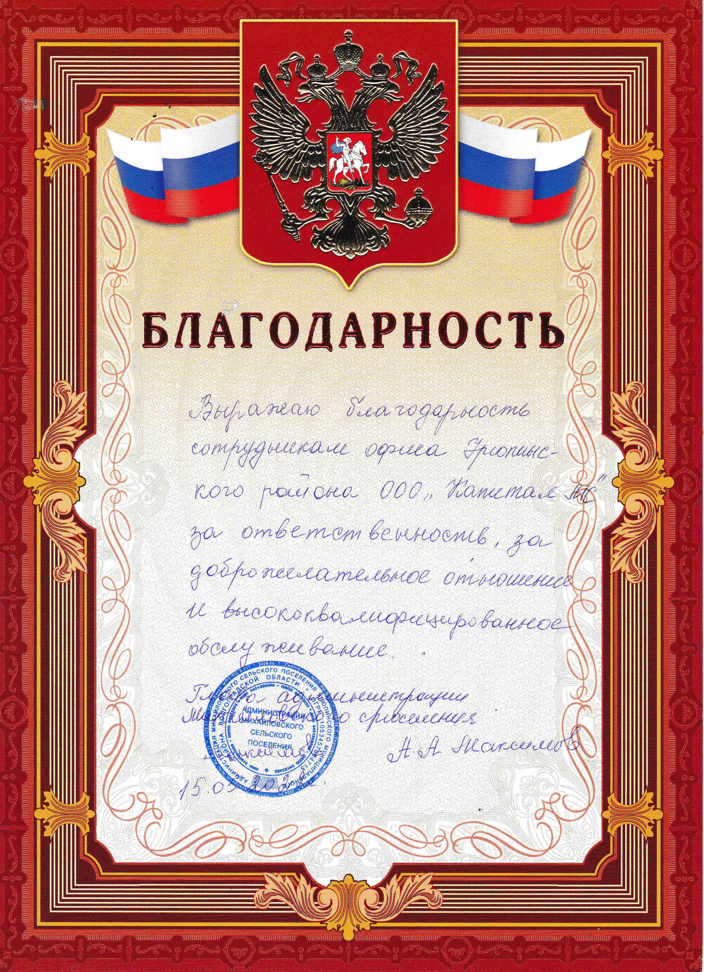 Благодарность Главы Администрации Михайловского...