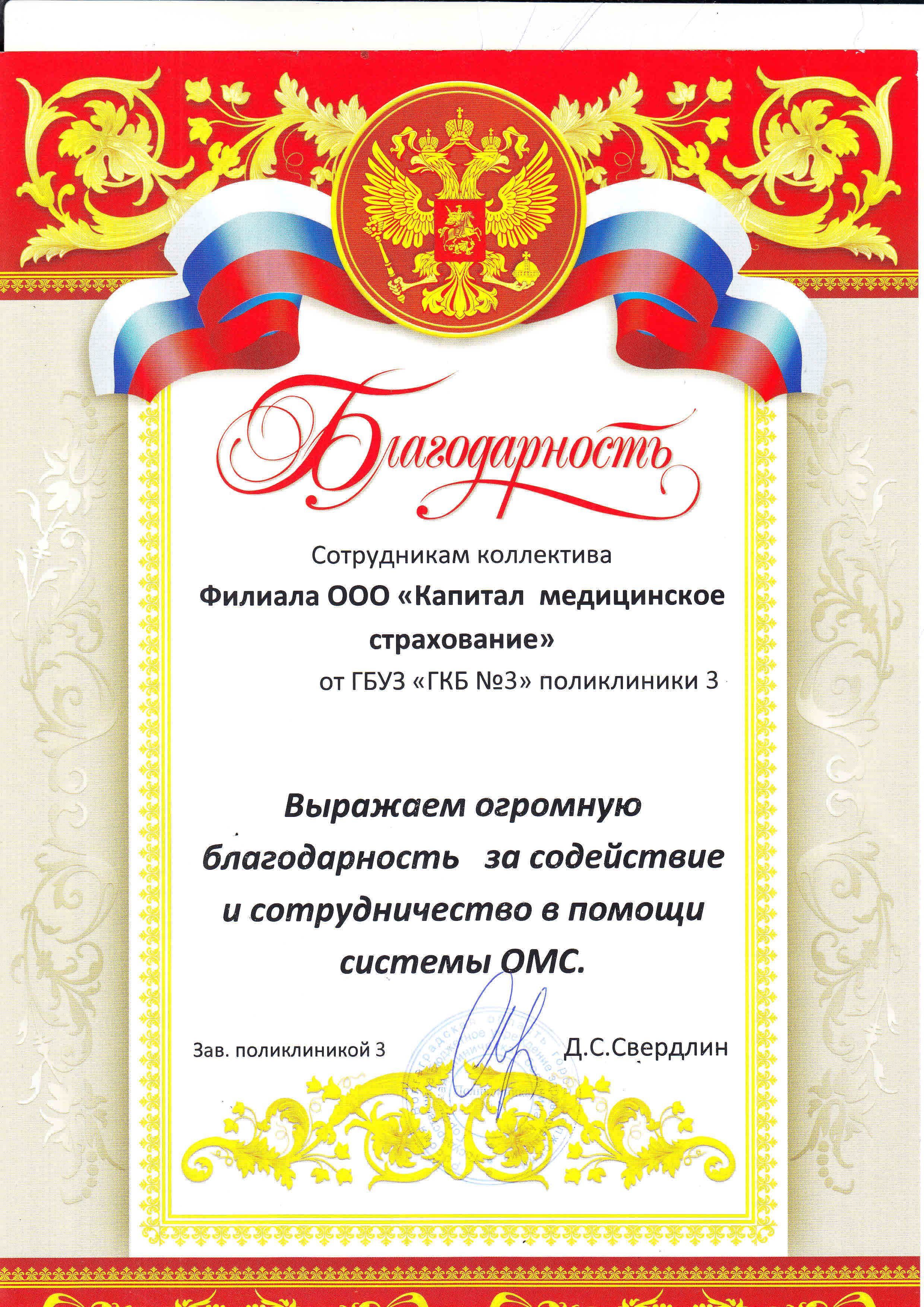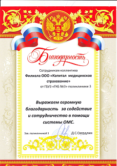 Благодарность ГБУЗ "ГКБ №3" поликлиника 3