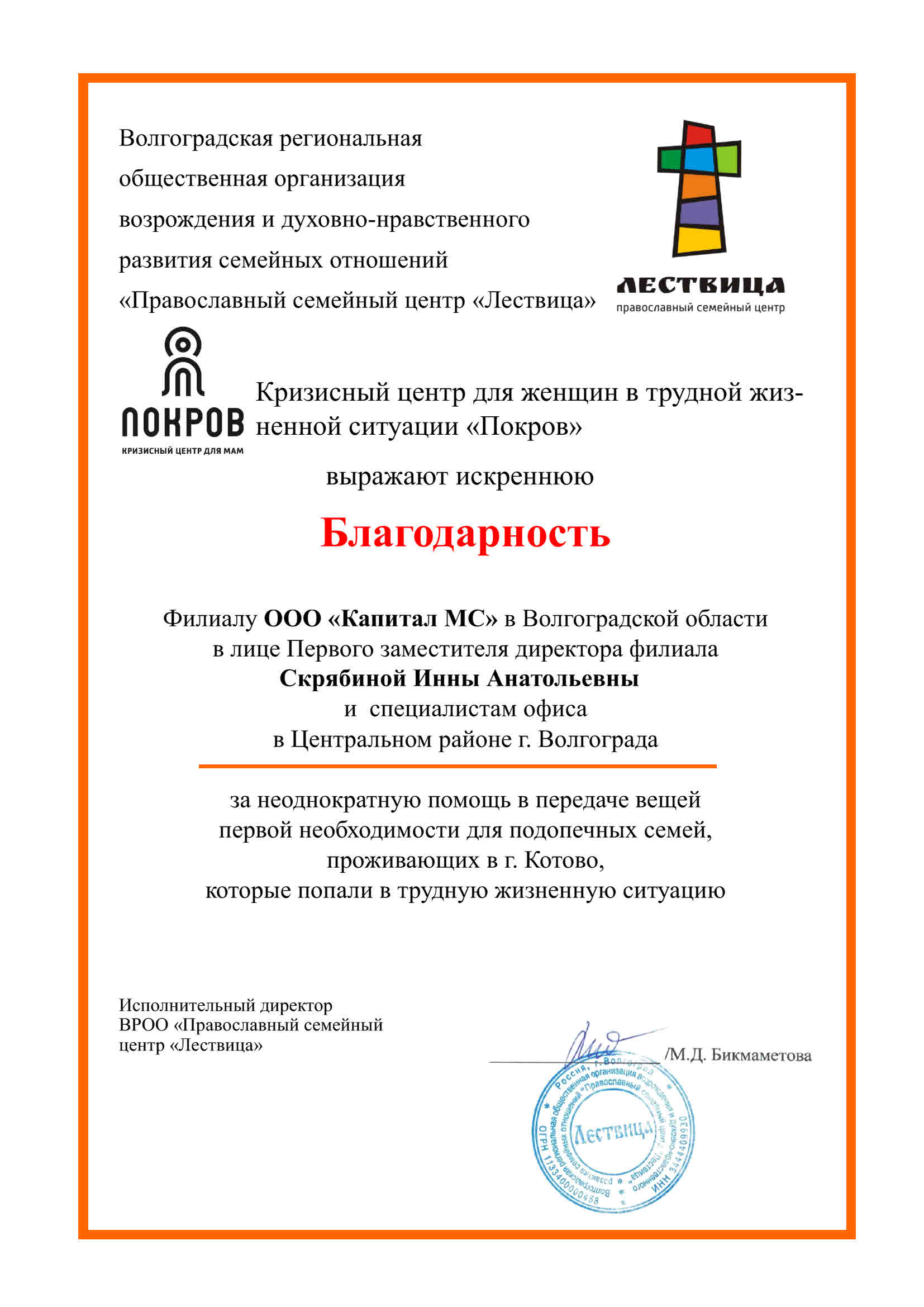 Благодарность ВРОО "Православный семейный центр...