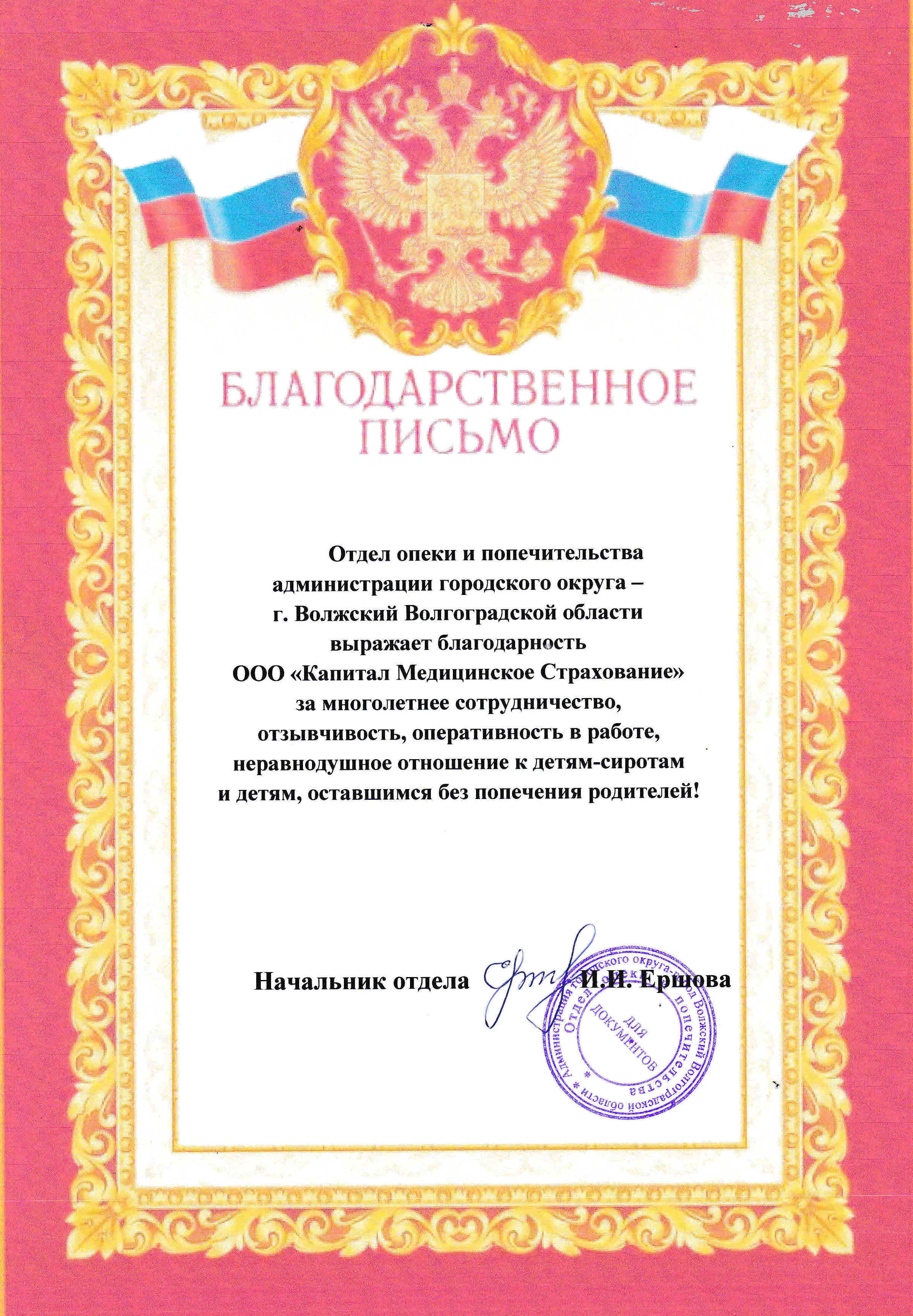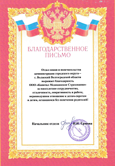 Благодарственное письмо Отдела опеки и...