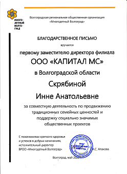 Благодарственное письмо ВРОО "Многодетный...