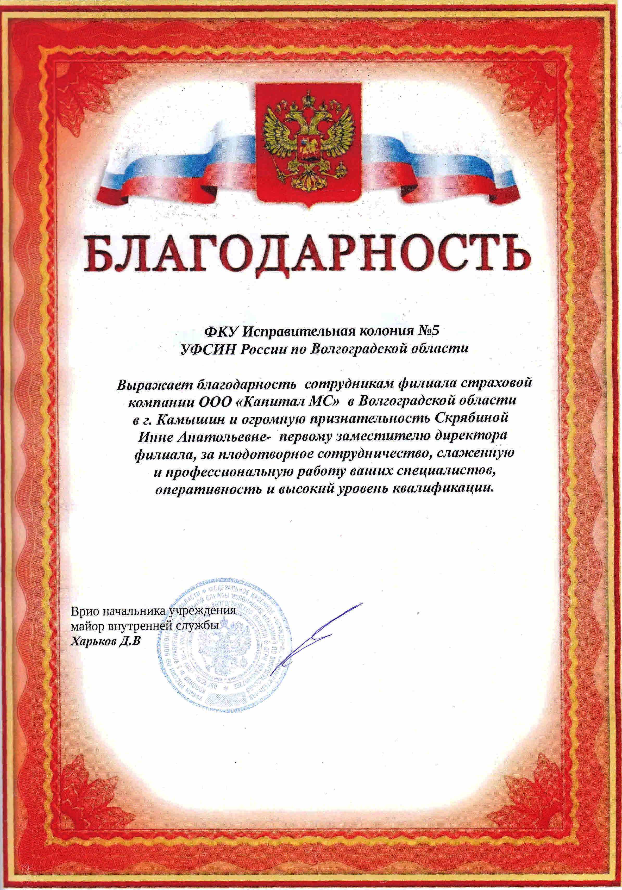 Благодарность ФКУ Исправительная колония №5