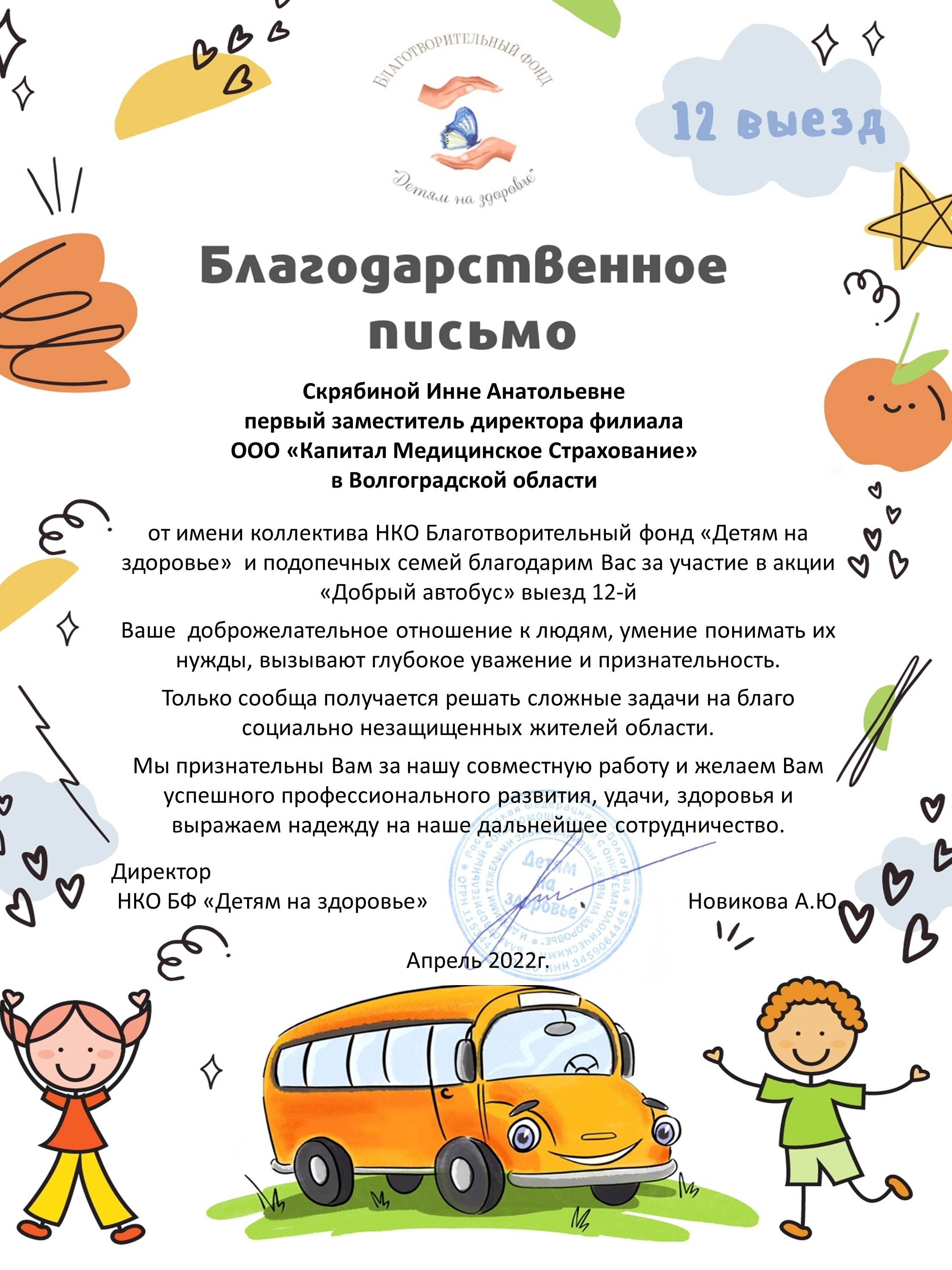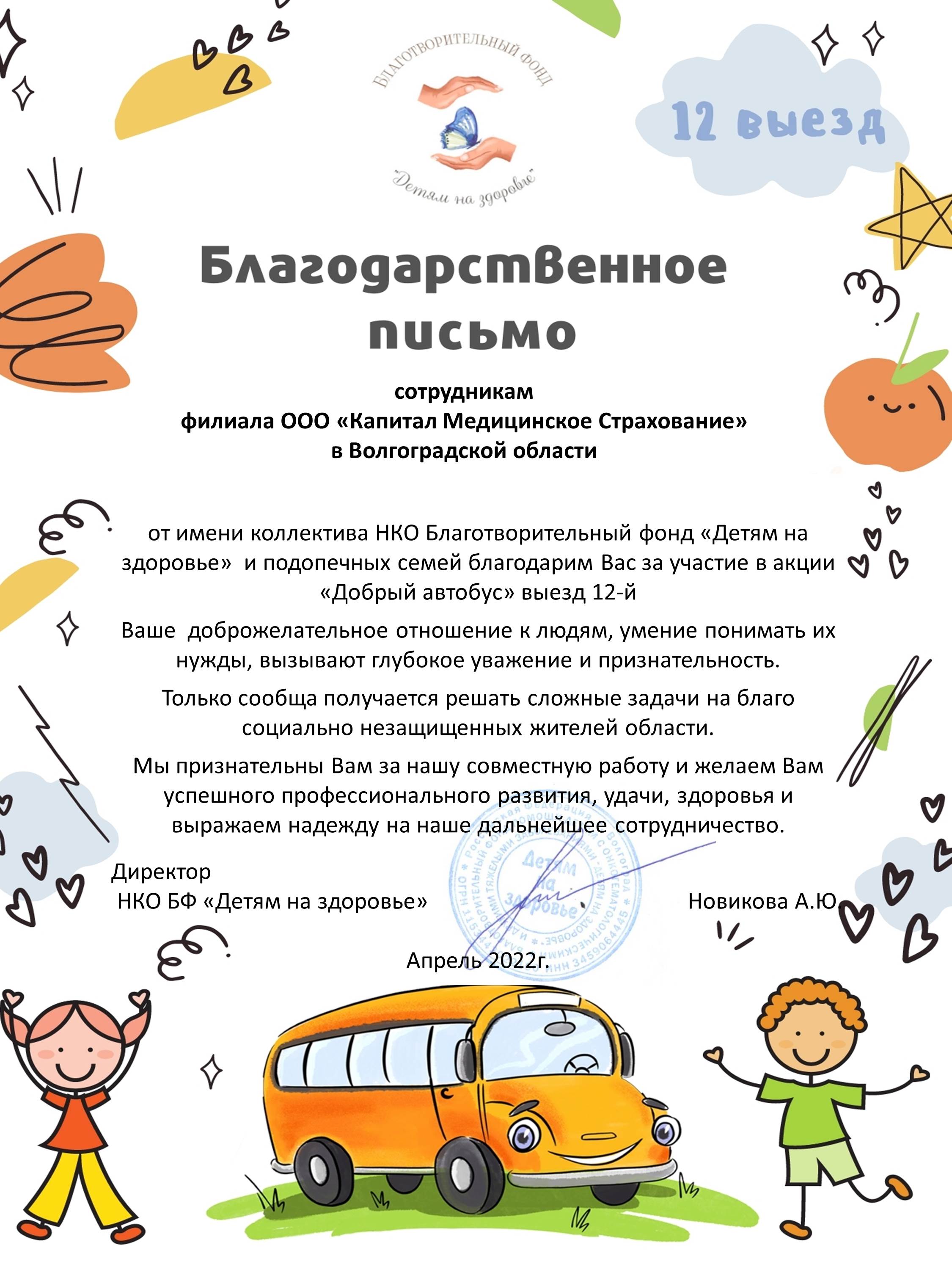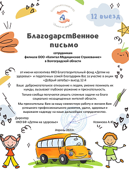 Благодарственное письмо коллектива НКО БФ "Детям...